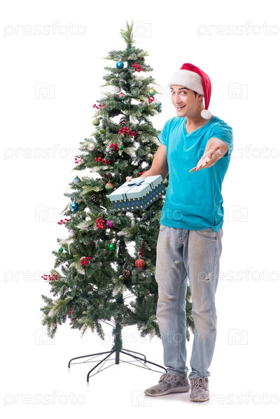 Молодой человек украшает рождественскую елку, изолированную на белом
