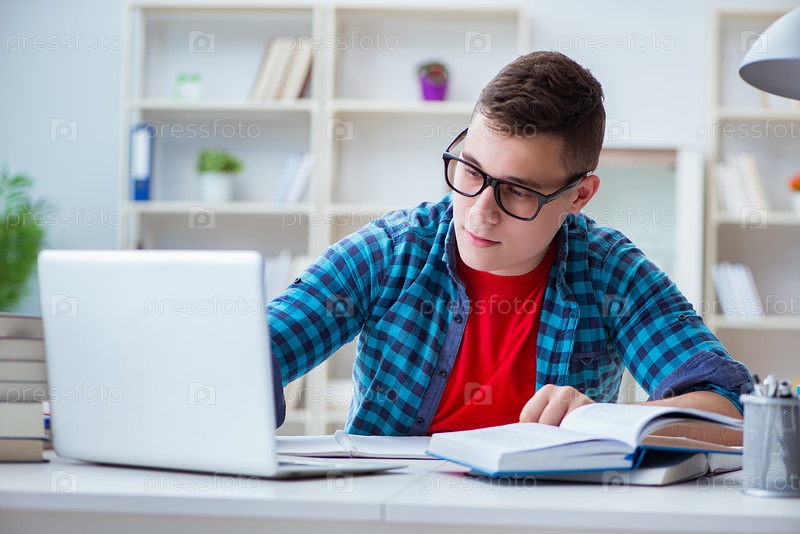 Юный подросток, готовящийся к экзаменам учится за столом в помещении