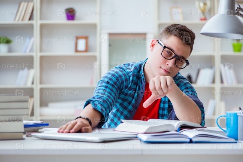 Юный подросток, готовящийся к экзаменам учится за столом в помещении
