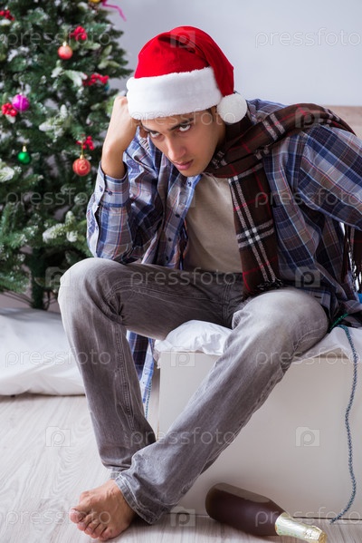 Мужчина страдает похмельем после рождественской вечеринки