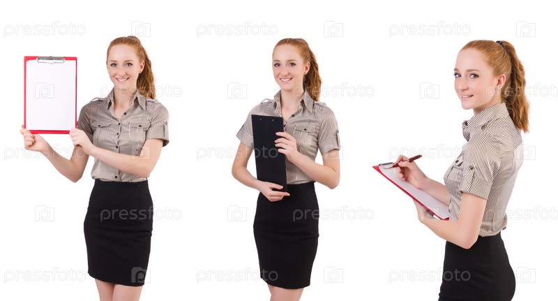 Привлекательная деловая женщина с связующим материалом, изолированным на белом