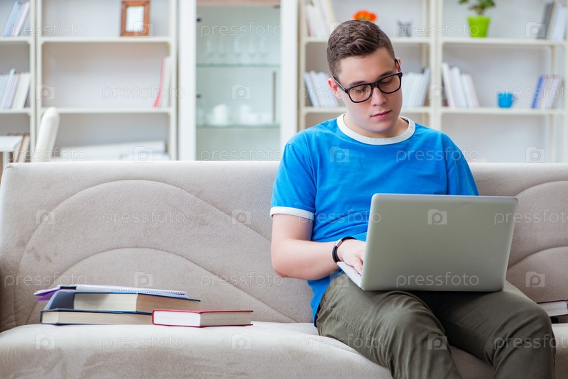 Молодой студент, готовящийся к экзаменам, учится дома на диване