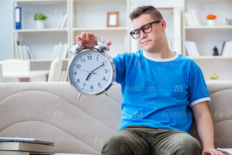 Молодой студент, готовящийся к экзаменам, учится дома на диване