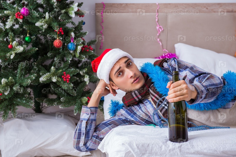Мужчина страдает похмельем после рождественской вечеринки