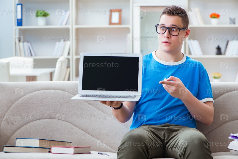 Молодой студент, готовящийся к экзаменам, учится дома на диване