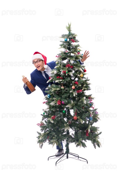 Бизнесмен украшает рождественскую елку, изолированную на белом