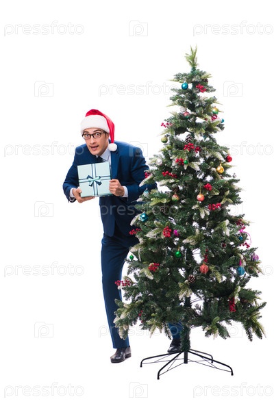 Бизнесмен украшает рождественскую елку, изолированную на белом