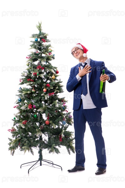Бизнесмен украшает рождественскую елку, изолированную на белом