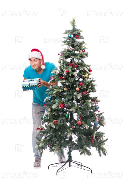 Молодой человек украшает рождественскую елку, изолированную на белом