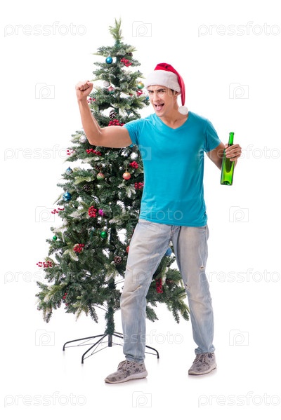 Молодой человек украшает рождественскую елку, изолированную на белом
