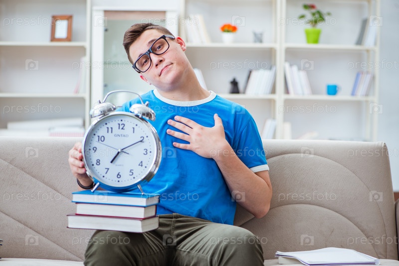 Молодой студент, готовящийся к экзаменам, учится дома на диване