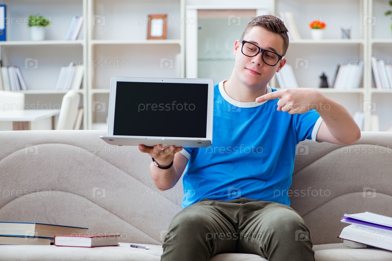Молодой студент, готовящийся к экзаменам, учится дома на диване