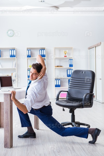 Молодой бизнесмен занимается спортом, вытягиваясь на рабочем месте