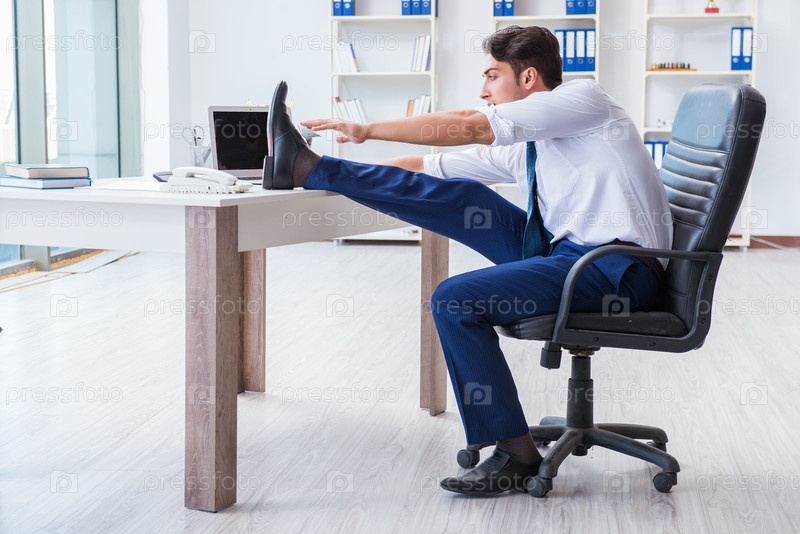 Молодой бизнесмен занимается спортом, вытягиваясь на рабочем месте