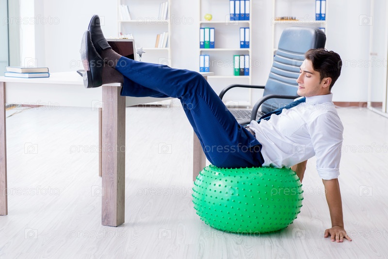 Молодой бизнесмен занимается спортом, вытягиваясь на рабочем месте
