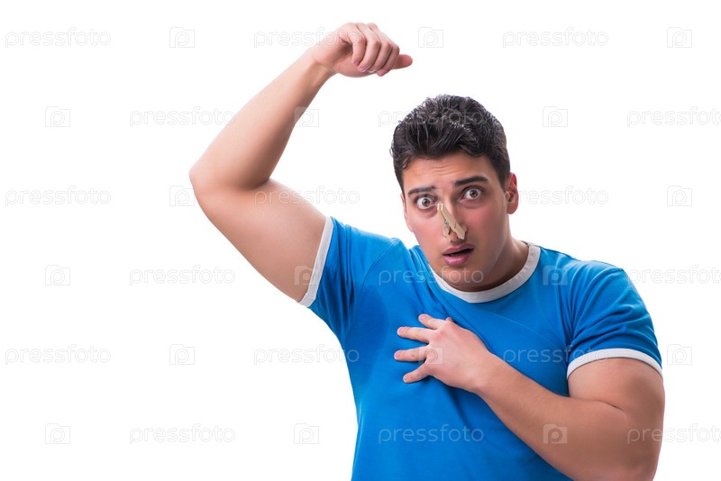 Мужчина, чрезмерно потеющий и плохо пахнущий изолированный на белом фоне