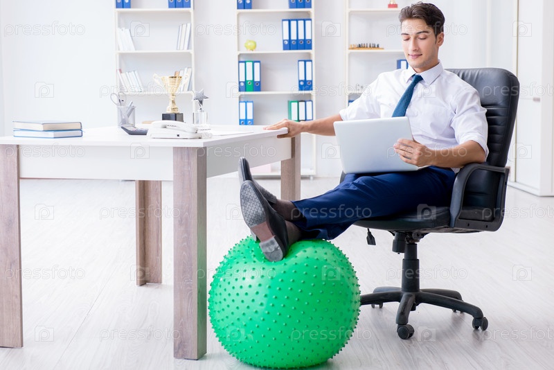 Молодой бизнесмен занимается спортом, протягиваясь на рабочем месте
