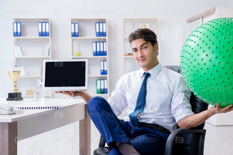 Молодой бизнесмен занимается спортом, протягиваясь на рабочем месте