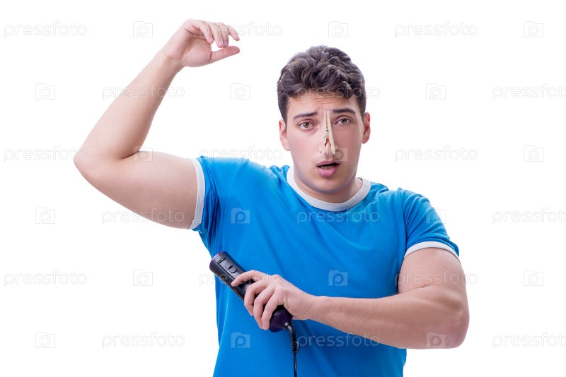 Мужчина, чрезмерно потеющий и плохо пахнущий изолированный на белом фоне