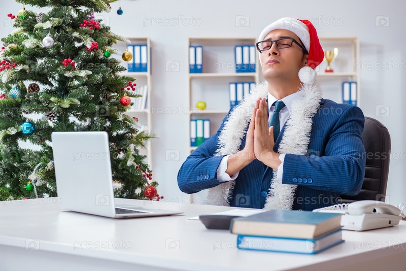 Бизнесмен празднует рождественские каникулы в офисе