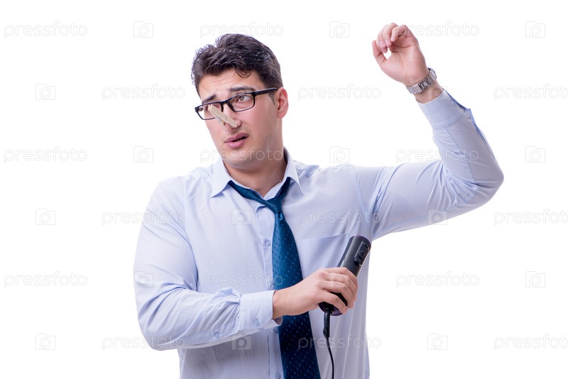 Бизнесмен чрезмерно потеет, плохо пахнет и изолирован на белом