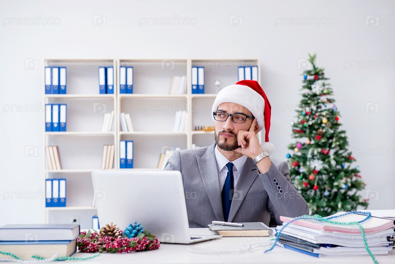 Молодой бизнесмен празднует Рождество в офисе