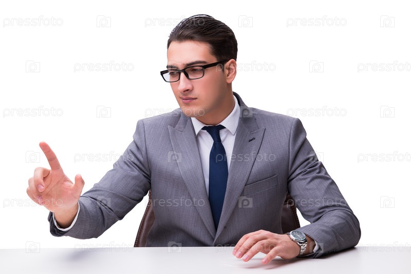Молодой бизнесмен нажимает виртуальные кнопки, изолированные на белом спине