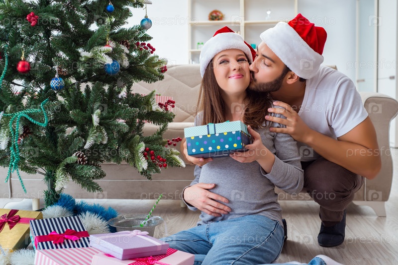 Молодая семья, ожидающая ребенка, празднует Рождество