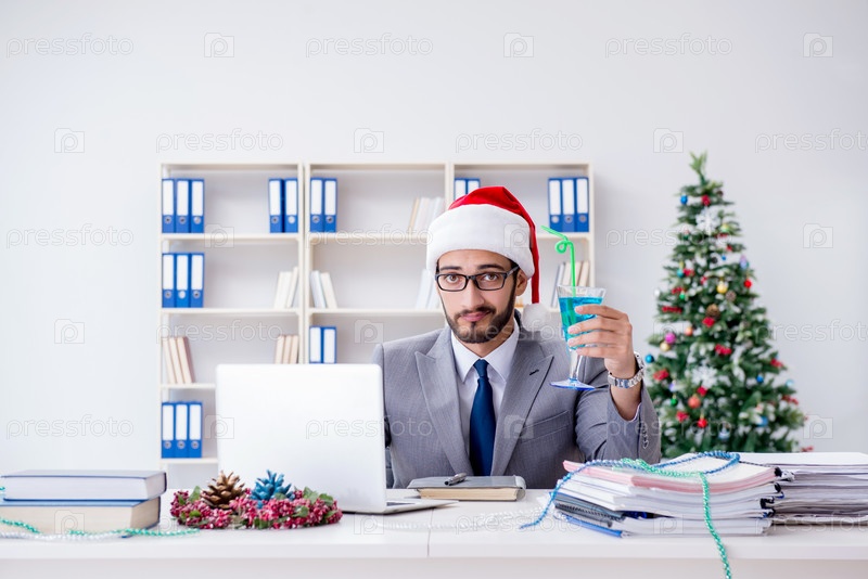 Молодой бизнесмен празднует Рождество в офисе