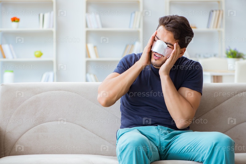 Молодой человек, восстанавливающийся дома после пластической операции на носу