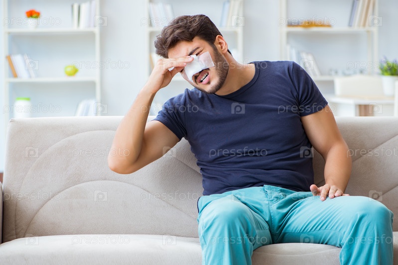 Молодой человек, восстанавливающийся дома после пластической операции на носу