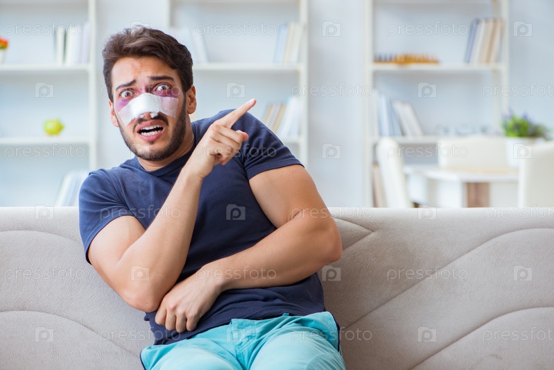 Молодой человек, восстанавливающийся дома после пластической операции на носу