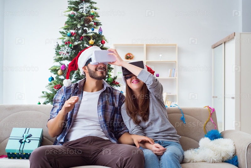 Счастливая семья, использующая очки виртуальной реальности VR во время Рождества