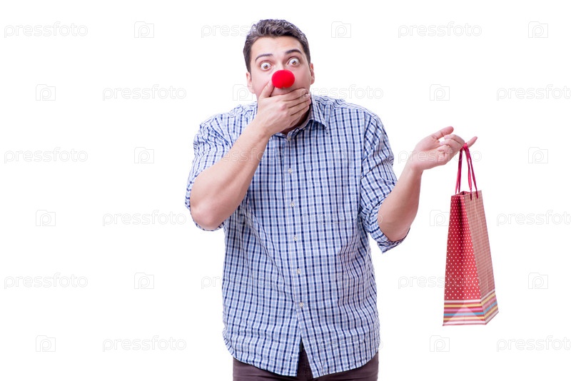 Мужчина с красным носом забавный, держащий в руках сумку для покупок подарок