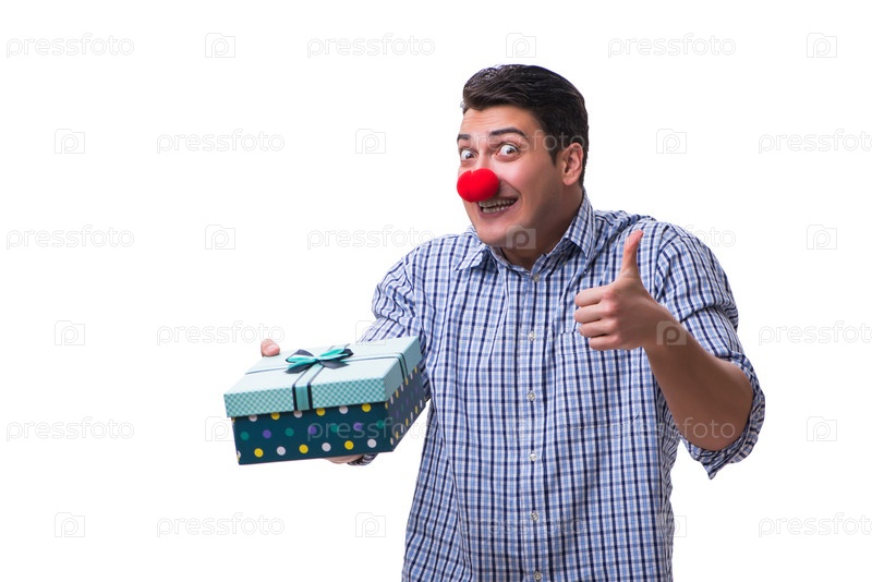 Мужчина с красным носом забавный, держащий в руках сумку для покупок подарок