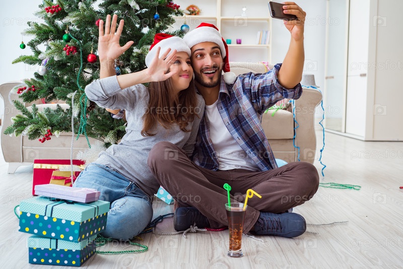 Молодая пара делает селфи во время Рождества