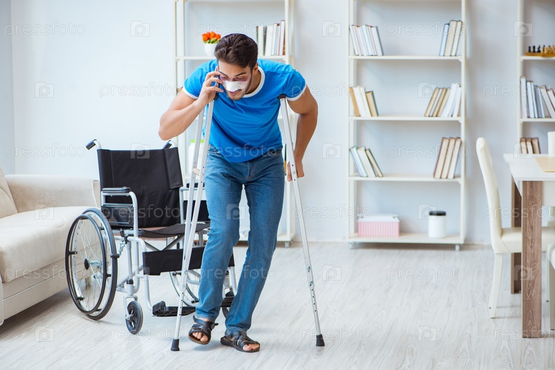 Молодой человек, восстанавливающийся после операции дома с костылями и рукой