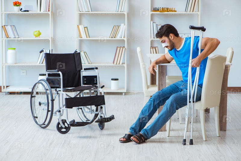 Молодой человек, восстанавливающийся после операции дома с костылями и рукой