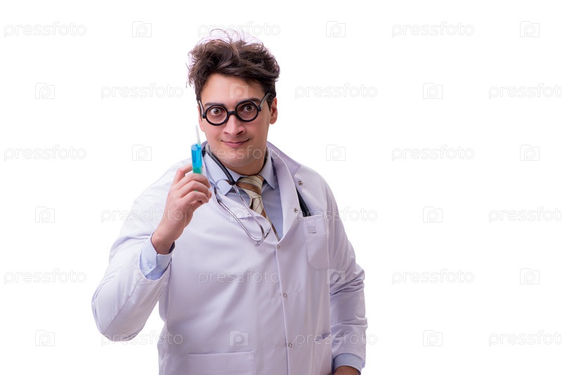 Забавный доктор со шприцем, изолированным на белом