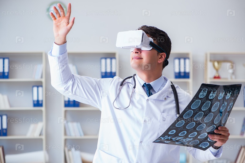 Молодой врач смотрит на МРТ-сканирование через очки VR