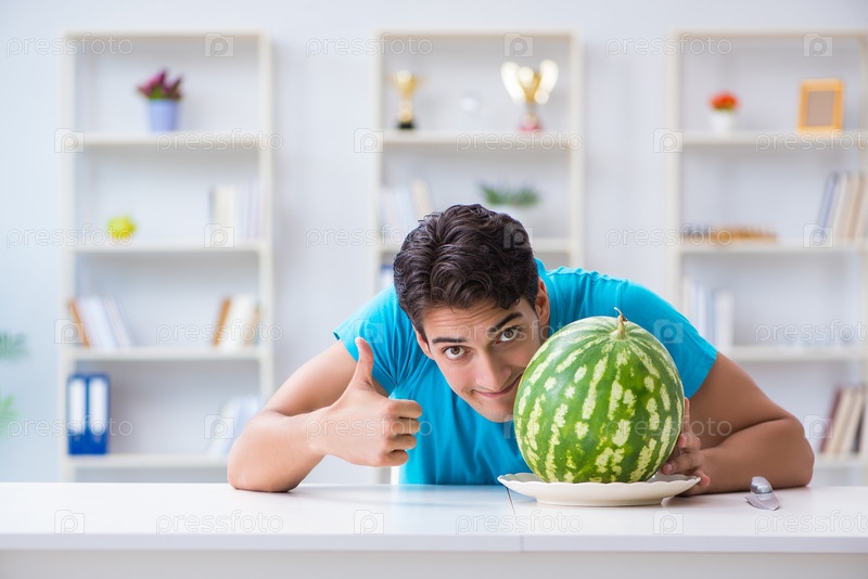 Мужчина ест арбуз дома