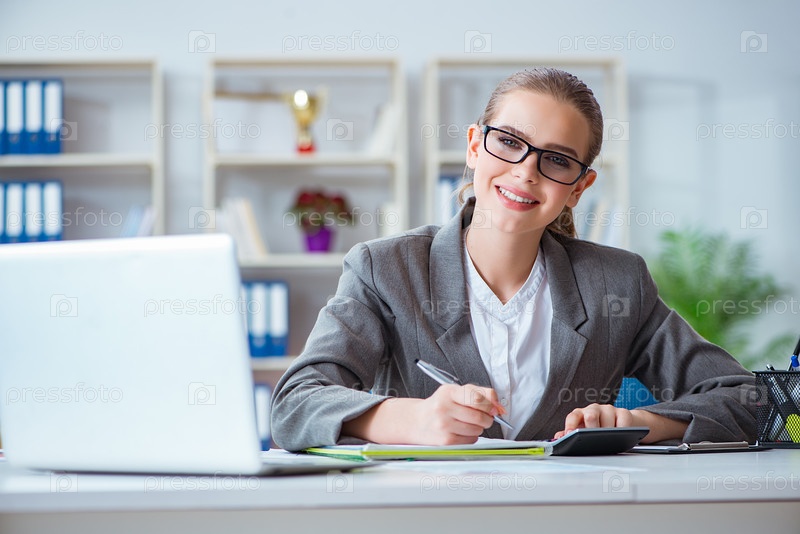Молодая деловая женщина-бухгалтер, работающая в офисе