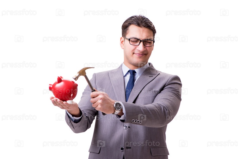 Бизнесмен ломает свинину изолированный белый фон