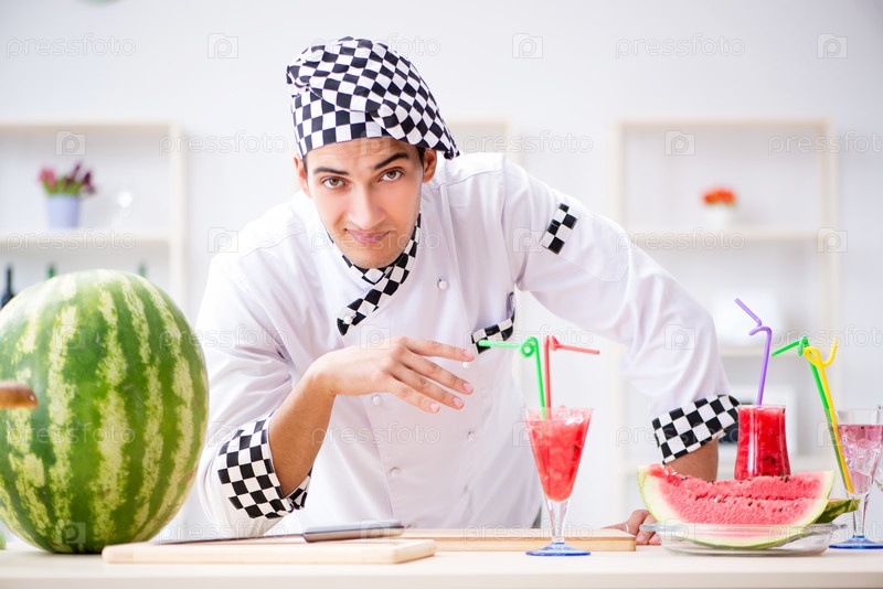 Мужчина готовит с арбузом на кухне