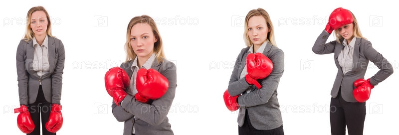 Женщина-бизнесменка с боксерскими перчатками на белом