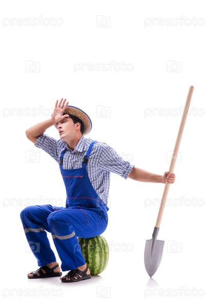 Молодой фермер с арбузом, изолированным на белом