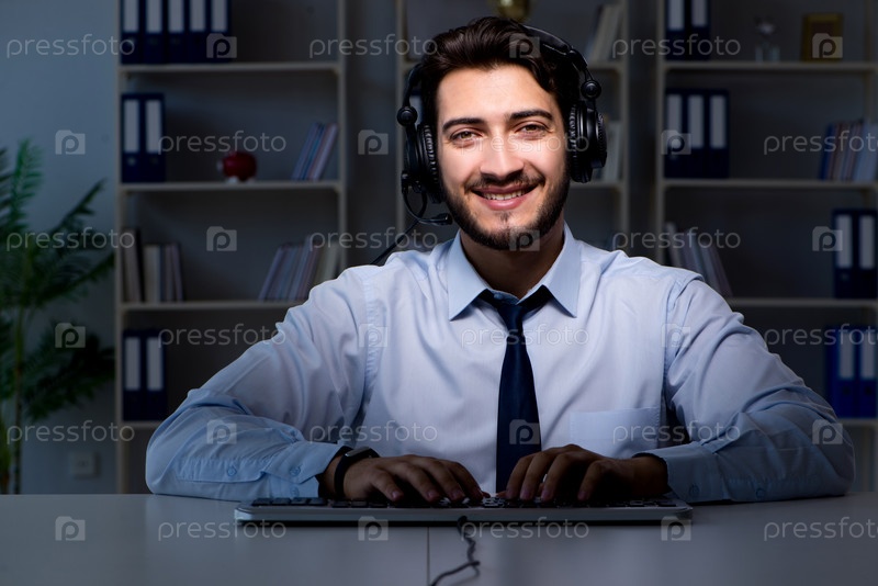 Молодой человек в концепции колл-центра работает допоздна сверхурочно в офисе