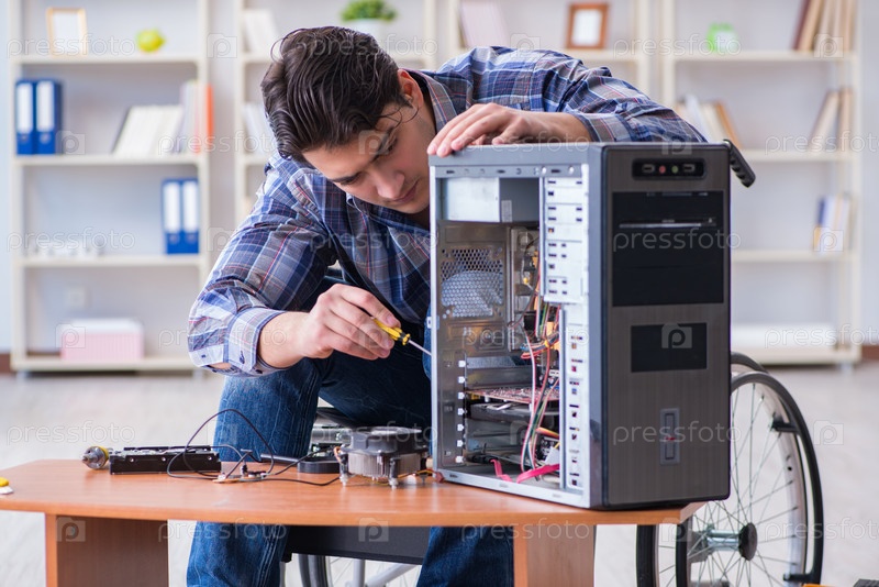 Инвалид в инвалидном кресле ремонтирует компьютер