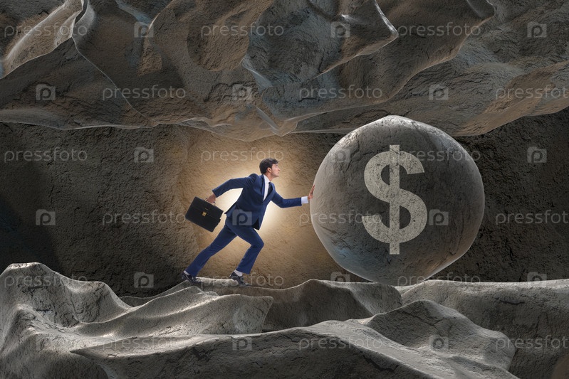 Бизнесмен, толкающий знак доллара в бизнес-концепции
