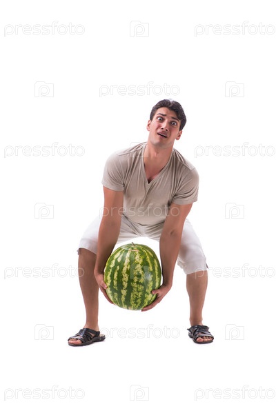 Молодой человек с арбузом, изолированным на белом